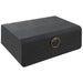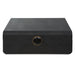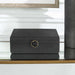 Inspired by the Art Deco era, this decorative box showcases a faux black shagreen wrapped surface accented by a brushed antique brass and black enamel closure. The interior is finished in matte black.