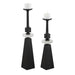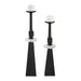 These tall floor candleholders combine modern elegance with rustic charm, crafted from stained black wood and accented by a distinctive seeded glass ring. The sleek, tall design creates a striking visual statement, perfect for illuminating any room with warmth and ambiance. Two 4x3 white candles included. Sizes: S-7x30x7, L-7x36x7