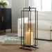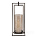 Illuminate your space with a warm glow from this textured glass and iron candle lantern. Designed to hold a pillar candle, it features a removable textured glass hurricane and iron stand finished in dark bronze with gold rub-through details. One white 3"x 5" candle is included.