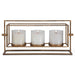 Illuminate your space with a warm glow from this textured glass and iron triple candle lantern. Designed to hold three pillar candles, it features removable textured clear glass hurricanes and iron stand with antique gold finish. Three, white 3"x 3" candles is included.