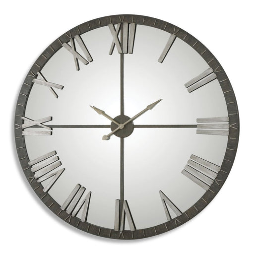 UttermostOversized wall clock featuring a distressed, rustic bronze metal with silver highlights and mirrored face. Quartz movement ensures accurate timekee...