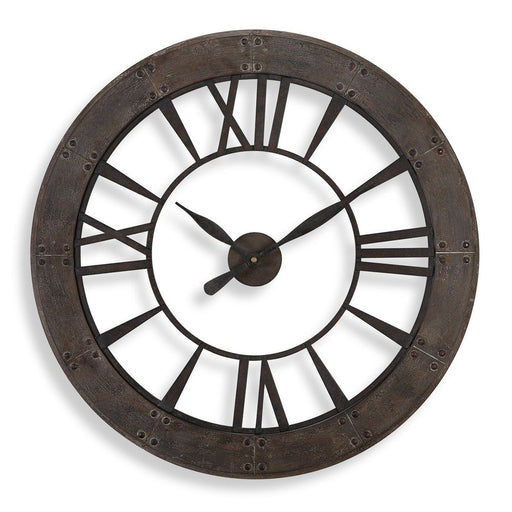 UttermostNatural stained, fir wood clock frame with hand forged, aged iron Roman numerals and floating center dial. Quartz movement ensures accurate timekee...