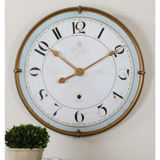 UttermostWall clock featuring an antiqued, gold metal frame with an antiqued ivory face and a pale blue accent around the inner edge. Quartz movement ensure...