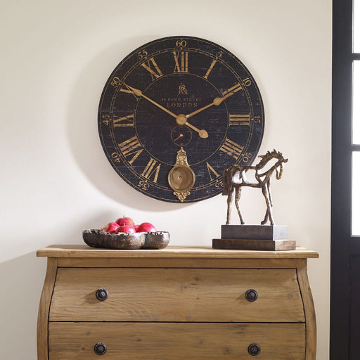 UttermostLaminated black clock face with a weathered crackled look, cast brass details and internal pendulum. Quartz movement ensures accurate timekeeping. ...