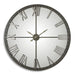 Oversized wall clock featuring a distressed, rustic bronze metal with silver highlights and mirrored face. Quartz movement ensures accurate timekeeping. Requires one "AA" battery.