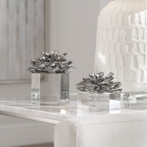 UttermostSimple elegance is achieved by these antiqued, metallic silver lotus blooms that appear to be floating on clear crystal cubes. Sizes: S-6x5x6, L-6x...