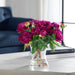 A vivid bunch of lush fuchsia peony cuttings placed in a fluted, clear glass vase with faux water.