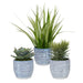 Succulent and grass trio are accented by naturally preserved moss in striking hand etched cobalt blue and white ceramic planters. Sizes: Sm-6x7x6, Med-7x8x7, Lg-22x16x22