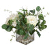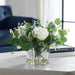 An airy mix as if freshly cut from the garden, featuring cream hydrangeas, roses, eucalyptus placed into a glass vase with faux water.