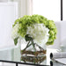 Filled with large summertime blooms, the Savannah bouquet shows off a variety of white and limelight hydrangea stems in a square glass vase with faux water.