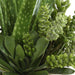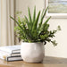 A fresh and textural mix of arid succulents, including aloe, crassula, sedum and echeveria, nestled in a mottled gloss white ceramic planter.