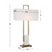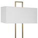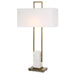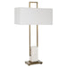 The Column lamp displays a modern look with square steel bars finished in plated brass and matching continuation finial, accented with a white marble pillar. The rectangular hardback shade is covered in a white linen fabric.