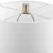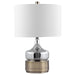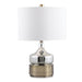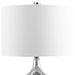 Paying homage to mid-century style, this table lamp features a chrome plated glass base displayed on a chunky antique brass plated foot and finial. The lamp is complemented by a round drum shade in a white linen fabric.