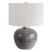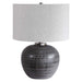 Finished in a charcoal glaze with etched texture, this table lamp adds a casual yet contemporary feel to a space. The round ceramic base is complemented by brushed nickel hardware. A round hardback drum shade in oatmeal linen completes the piece.
