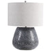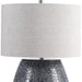 Reminiscent of natural river stones, this table lamp showcases an embossed textured ceramic base in a metallic charcoal gray finish with brushed nickel plated details. A light gray linen drum shade with natural slubbing accents the piece.
