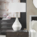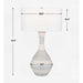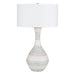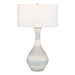 Handcrafted from ceramic, the Potter Table Lamp features a fluted base finished in a striped soft ivory, blue, and tan glaze, paired with antique brass plated details. The round hardback shade is covered in a crisp white linen fabric. Due to the nature of fired glazes on ceramic lamps, finishes will vary slightly.