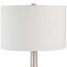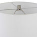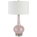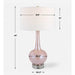 Elegant and sophisticated, the Rosa Table Lamp showcases a light blush pink glass base with brushed nickel and crystal details. The hardback drum shade is covered in a white cotton fabric.