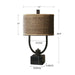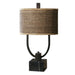 Rustic bronze metal with burnished edges and a black marble foot. The oval drum shade is brown and tan woven rattan with decorative trim.