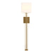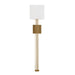 Our refined 2 Lt. sconce features a square white hardback fabric shade in a warm brass finish with an overstated architectural tail. 2-60 watt max candelabra sockets. Bulbs not included.