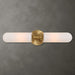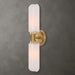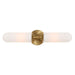 Old school tradition shows in our 2 Lt. sconce of warm brass finish with opal white glass. Can be installed horizontal or vertical as sconce or vanity with it's Damp label certification.. 2-60 watt max Edison sockets, our designer suggest type T bulbs. Bulbs not included.