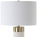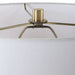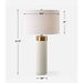 The Wessex Table Lamp features a white faux shagreen covered base with iron accents finished in a plated antique brushed brass. The round hardback drum shade is a casual white linen fabric.