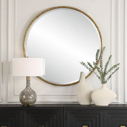 UttermostWith its aged gold finish and subtle plaster effect, the Sutton Round Mirror is a blend of timeless elegance and rustic charm. Mirror features a 1"...