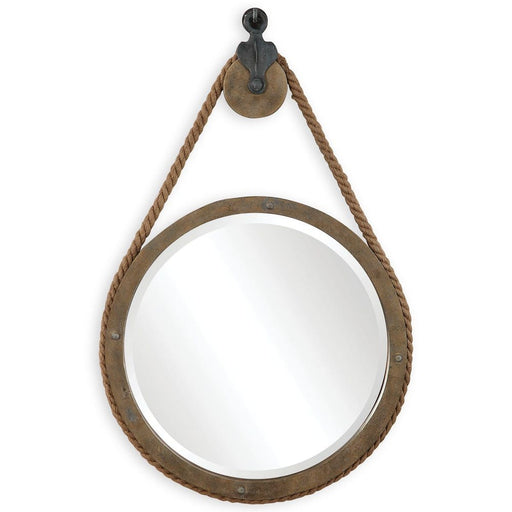 UttermostThis rustic mirror design features an aged natural wood finish with exposed nail head accents and thick rope detailing that surrounds the mirror's ...