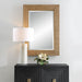 Showcasing a solid wood frame beautifully wrapped in natural grass cloth and accented with a gold leaf metal inner liner. Mirror has a generous 1" bevel. May be hung horizontal or vertical.