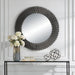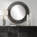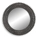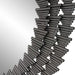 A contemporary work of art, this 3-dimensional round frame features hand cut iron dowels in varying lengths arranged in three layers, finished in a burnished steel silver. The mirror is surrounded by a generous 1 1/4" bevel.