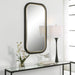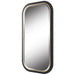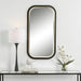 The Nevaeh mirror displays an elegant curved profile with a satin black finish, accented with a petite gold leaf inner edge. Mirror features a generous 1 1/4" bevel. May be hung horizontal or vertical.