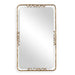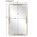 This stunning floating mirror design features hand forged ironwork with hammered texture and tribal inspired detailing, finished in a heavily antiqued gold. May be hung horizontal or vertical.