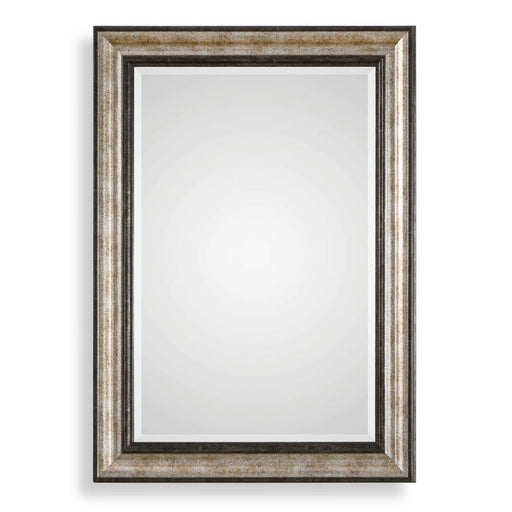 UttermostSharply sloped design with a nicely curved outer edge, finished in a two-tone antiqued metallic silver and rustic dark bronze. Mirror is beveled an...
