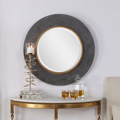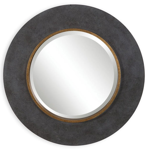 UttermostThis round mirror features a sleek, solid wood constructed outer frame that is finished in mottled charcoal concrete look, accented with a raised a...