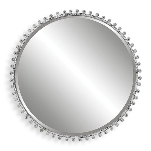 UttermostPetite iron spheres line the outer edge of this round frame, finished in a heavily distressed aged white with rustic black undertones. Mirror featu...