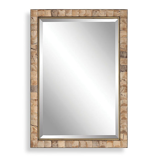 UttermostThis rectangular mirror showcases an iron strap frame finished in dark gold, accented by concaved, polished coconut shells inlays. Each shell may v...
