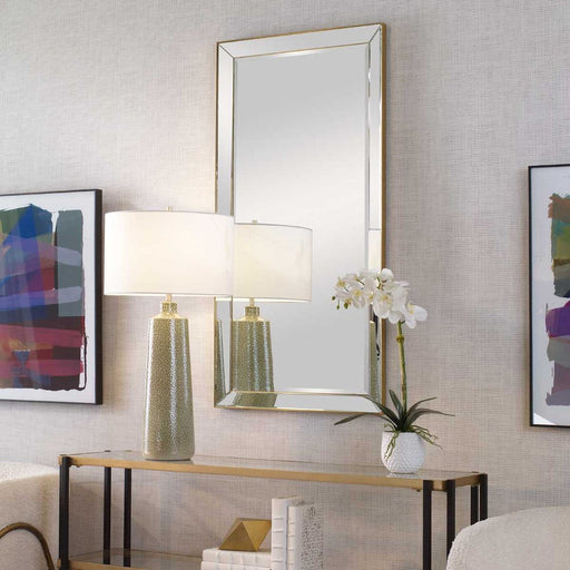 UttermostDisplaying a classic elegance, this rectangular mirror has a slim gold outer and inner edge, encasing a raised beveled mirror frame, creating a sop...