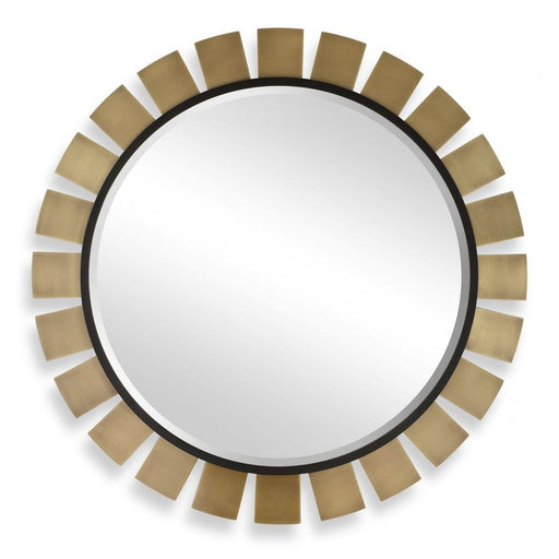 UttermostThe Toluca Round Mirror showcases a petite black inner frame, encircled by a metal sunburst motif finished in plated antique brass. Mirror has a 1"...