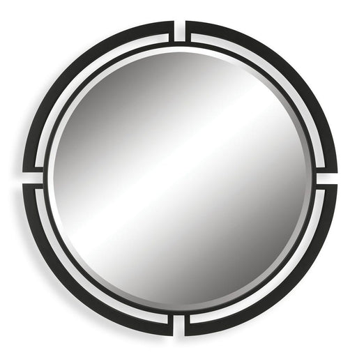 UttermostThe Quadrant round mirror showcases contemporary influence with a thick 3-dimensional iron frame in a sleek satin black finish. Mirror has a genero...