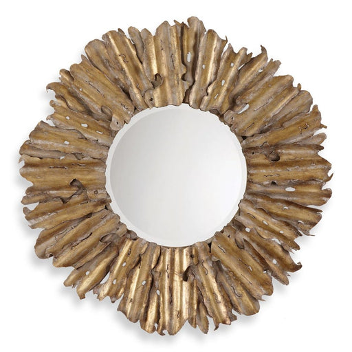 UttermostThis stunning round mirror is sure to make a statement in any space. The frame is crafted from forged iron finished in a metallic gold leaf, accent...