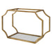 Whimsical, deep shelving units in hand forged iron with a curved, open-framed design finished with lightly antiqued gold leaf and clear glass bottom shelves. Great for displaying those special treasures. Sizes:Sm-16x10x7, Med-18x12x7, Lg-20x18x7