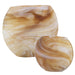 The Fusion Vases are crafted entirely from glass, in a swirled caramel, ivory, and tan finish. Accent with your favorite florals or group with additional accessories. Sizes: S-7x6x4, L-10x9x4