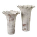 Elevate your decor with our exquisite set of two distressed white vases, featuring subtle rust brown undertones and delicate petal edges. Perfect for adding a touch of vintage elegance to any space, these charming vases blend rustic charm with sophisticated design, making them a timeless addition to your home. Sizes: S-11x13x11, L- 11x16x11