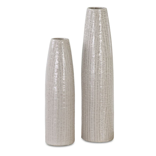 UttermostSet of two ceramic vases embrace the iconic look of modern décor. These decorative vases feature a free flowing, carefree design finished in a tarn...