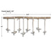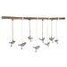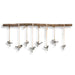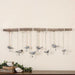 Small metal birds finished in a dark bronze with a light ivory glaze suspended from a natural elm branch with ivory ribbon and natural rope. Each bird has a clip at feet for hanging pictures or notes. Size and shape of branch will vary.