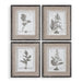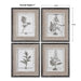 These botanical prints feature a contemporary take on an antique style. Each black and white print is surrounded by a light tan burlap mat. The outer frames have a heavily distressed black finish with a gray and taupe wash. The inner lips and fillets have a medium wood tone base with a heavily distressed white painted finish and a gray and taupe glaze. Each print is placed under protective glass.