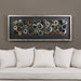 Abstract in design, this art features overlapping, blow torched iron discs with hand painted acrylic accents in tones of silver, brown and antique gold. The art is under glass and is encased by a lightly antiqued silver leaf frame. May be hung horizontal or vertical.