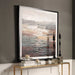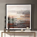Modern in design, this hand painted abstract on canvas presents a masculine style. Deeply textured shades of gray, tan, and soft yellow fade to darker red-brown, blue, and green hues. An unpainted white canvas border surrounds the artwork. A wooden, black satin frame completes the piece. Due to the handcrafted nature of this artwork, each piece may have subtle differences.