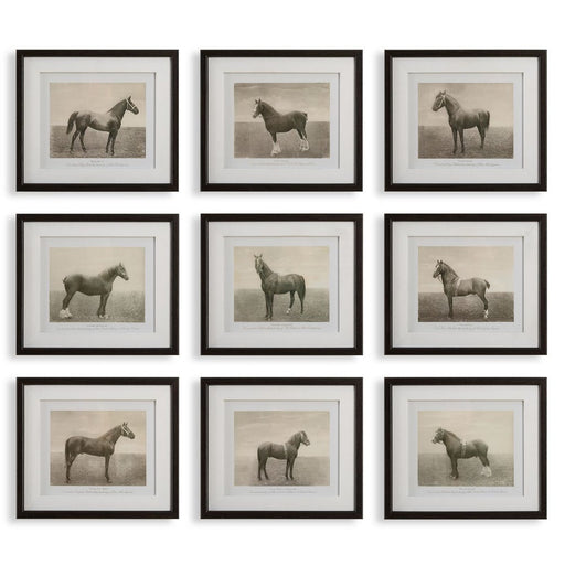 UttermostThis regal set showcases nine antiqued sketches of horses belonging to dignitaries and elite members of society. Surrounded by a beveled wood grain...