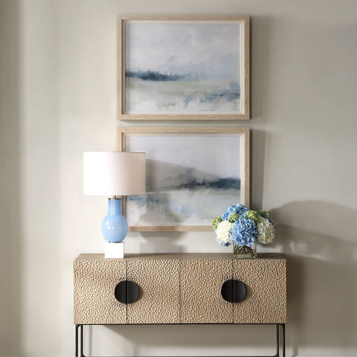 UttermostThese tranquil landscape prints are shown under glass featuring watercolor shades of navy blue and sage. Each print is accented by a white linen li...