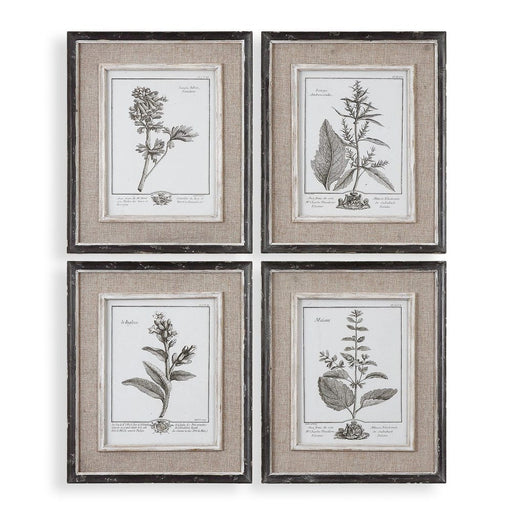 UttermostThese botanical prints feature a contemporary take on an antique style. Each black and white print is surrounded by a light tan burlap mat. The out...